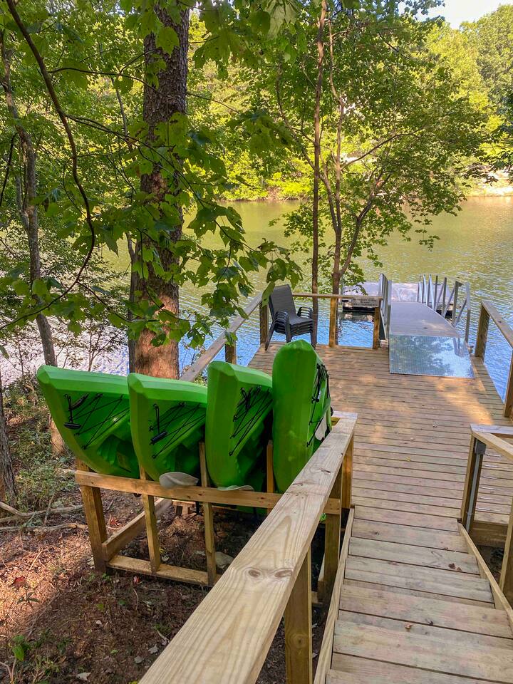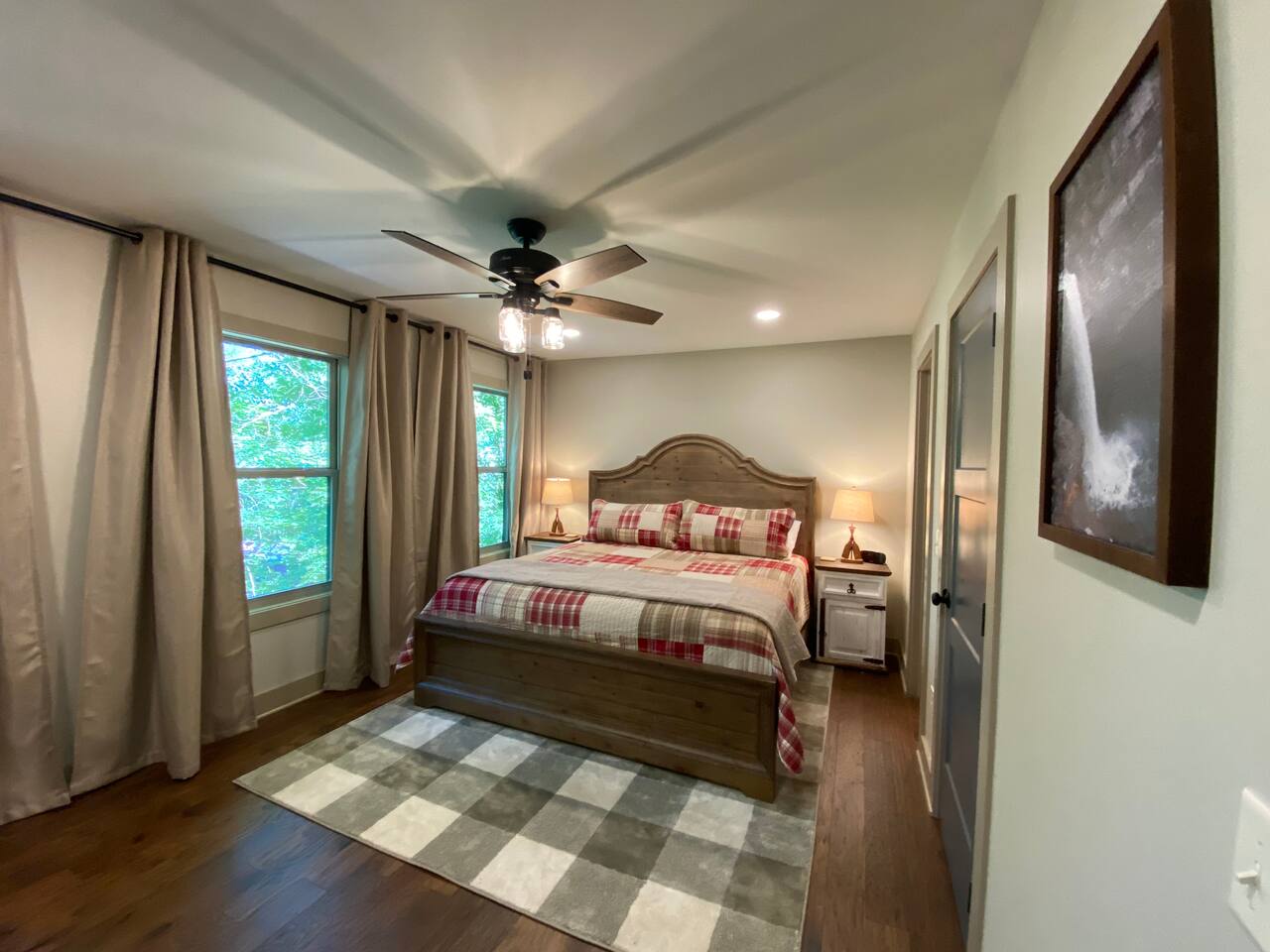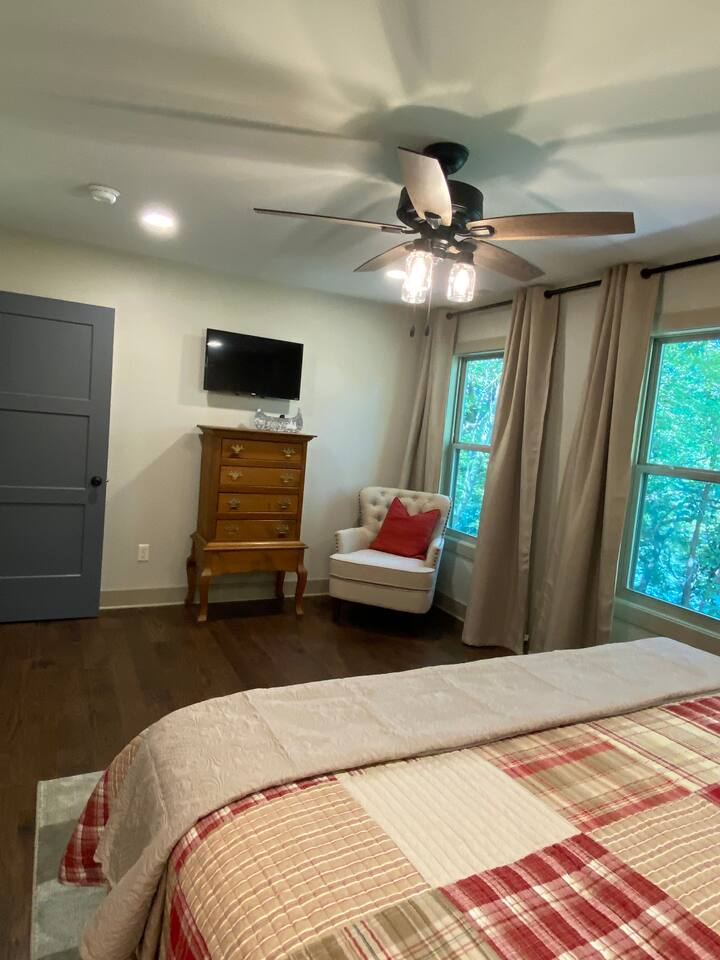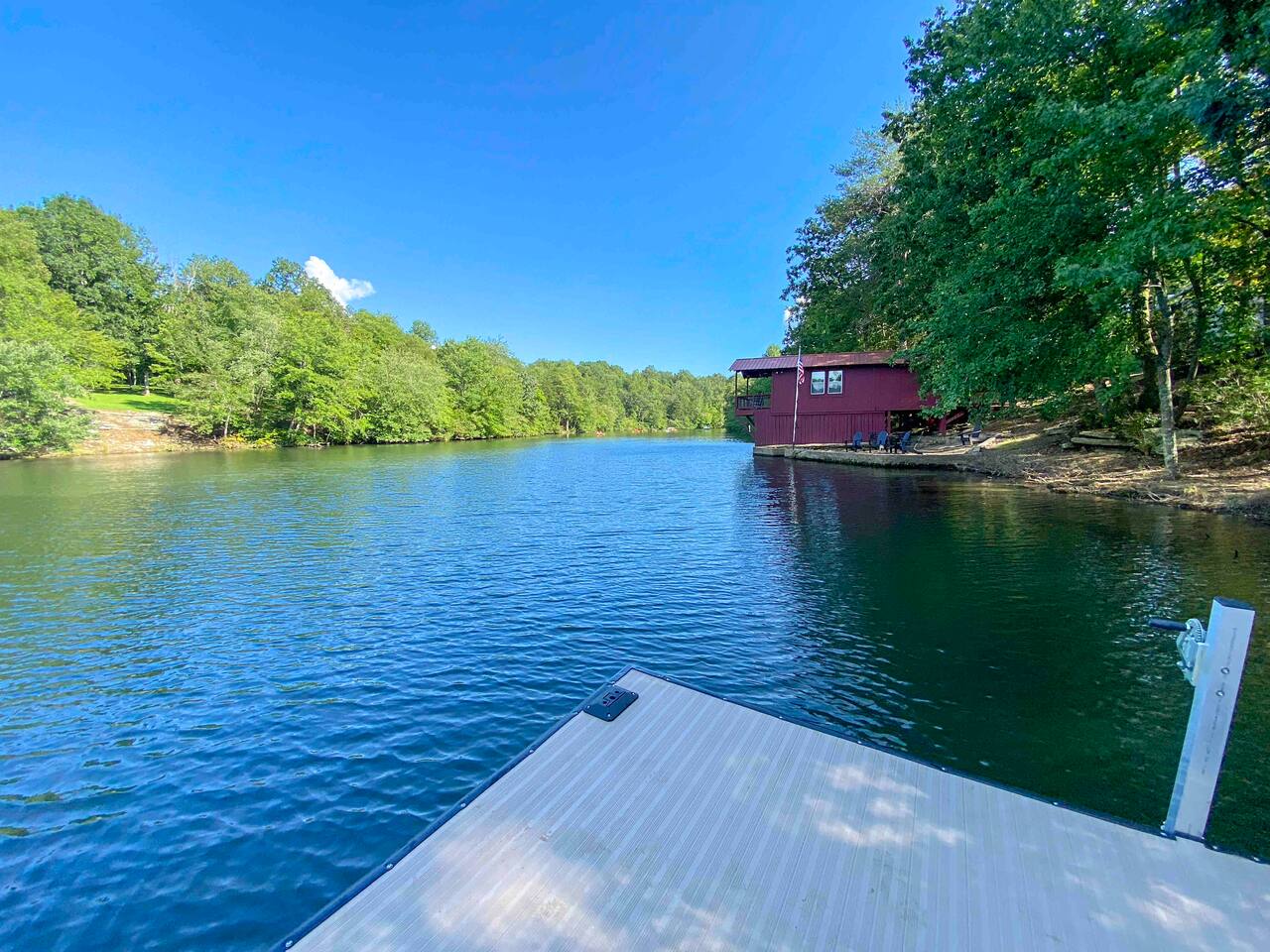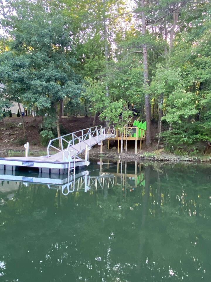 At Lazy River Cottage, enjoy a 32' long covered sitting porch facing Little River, complete with a 5’ porch swing and 4 of your favorite rocking chairs. Lazy River Cottage sleeps 10 and has three bedrooms and a sleeping loft. There are two large master bedrooms, both with king beds, private master bathrooms, and a wall of windows with beautiful river views, one on each floor. There is a third bedroom upstairs with a queen bed and semi-private bathroom that is shared with a large sleeping loft. The sleeping loft sleeps four with two twin beds, each with trundles. See the bedroom and bathroom floorplan layouts at our website littlerivervacay.com. Downstairs is "wheelchair friendly", not ADA compliant, with 36" doorways, a ramp from the parking area, and a walk-in oversized shower in the master bedroom on the main floor. The first floor also includes a half bath, a fully equipped kitchen with dishwasher, multi-cup coffee maker, microwave, custom wood island that seats two, dining area that accommodates eight, gas fireplace, and washer and dryer. The fire pit area includes adirondack chairs for enjoying the nights by the river. There is a sitting area by the water with a floating dock perfect for fishing, swimming, or kayaking.