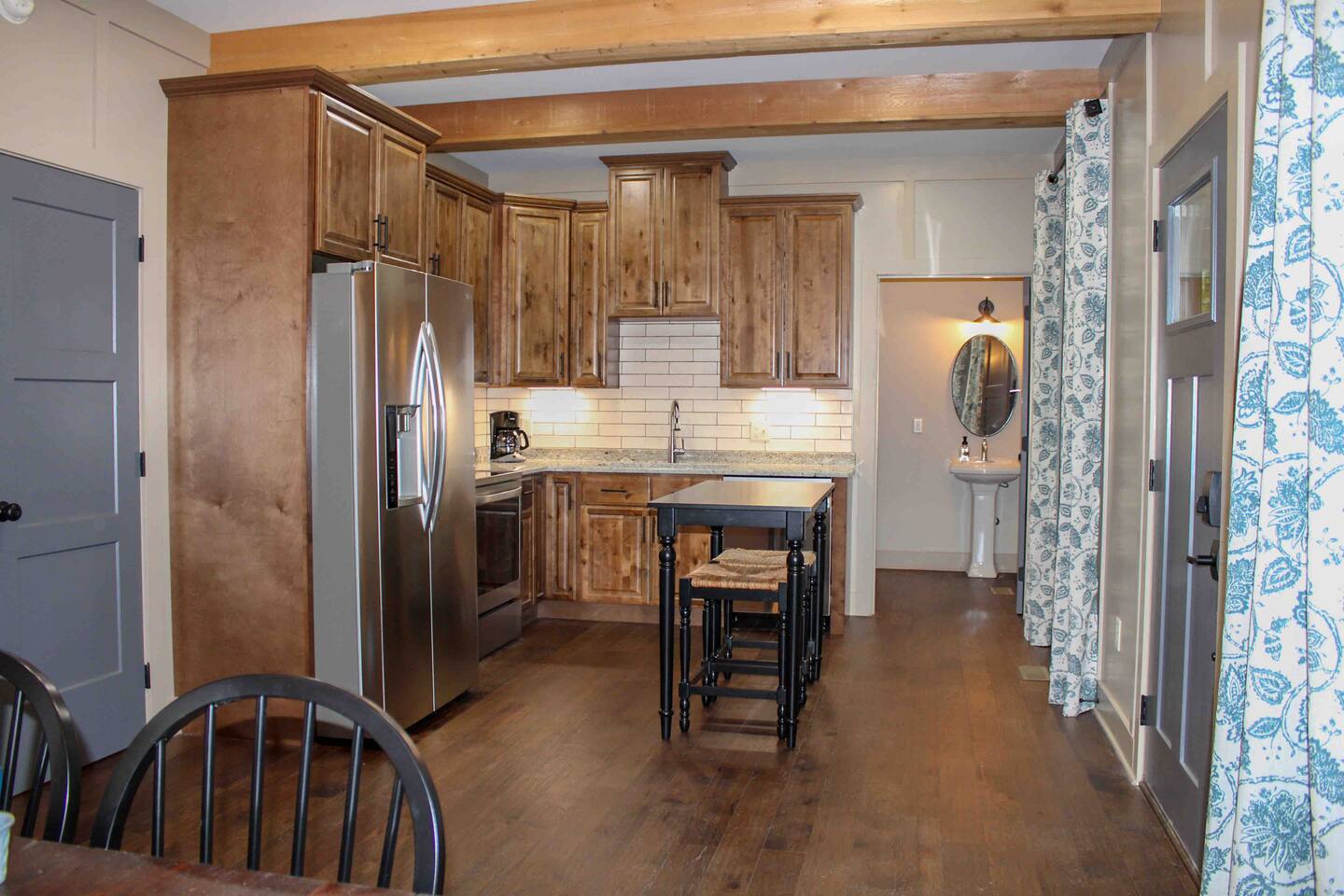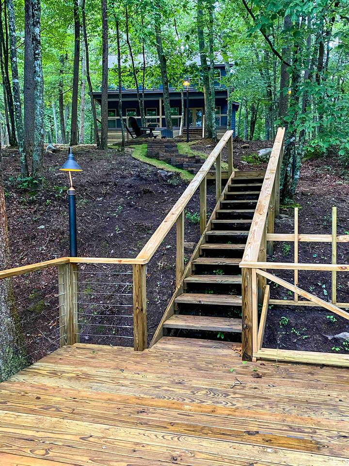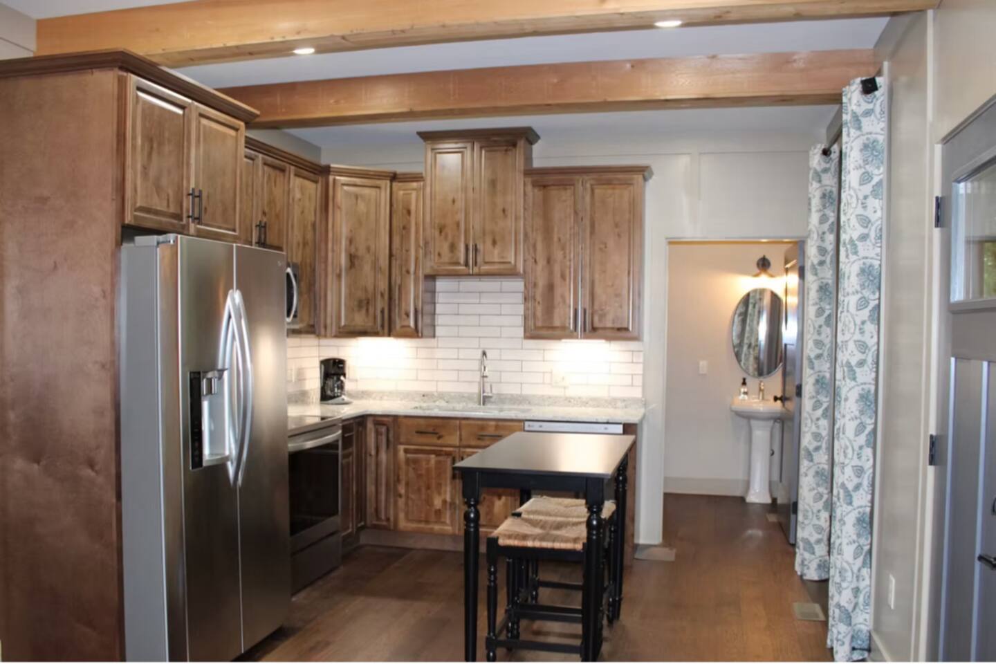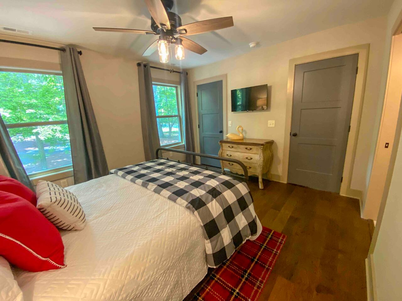 At Lazy River Cottage, enjoy a 32' long covered sitting porch facing Little River, complete with a 5’ porch swing and 4 of your favorite rocking chairs. Lazy River Cottage sleeps 10 and has three bedrooms and a sleeping loft. There are two large master bedrooms, both with king beds, private master bathrooms, and a wall of windows with beautiful river views, one on each floor. There is a third bedroom upstairs with a queen bed and semi-private bathroom that is shared with a large sleeping loft. The sleeping loft sleeps four with two twin beds, each with trundles. See the bedroom and bathroom floorplan layouts at our website littlerivervacay.com. Downstairs is "wheelchair friendly", not ADA compliant, with 36" doorways, a ramp from the parking area, and a walk-in oversized shower in the master bedroom on the main floor. The first floor also includes a half bath, a fully equipped kitchen with dishwasher, multi-cup coffee maker, microwave, custom wood island that seats two, dining area that accommodates eight, gas fireplace, and washer and dryer. The fire pit area includes adirondack chairs for enjoying the nights by the river. There is a sitting area by the water with a floating dock perfect for fishing, swimming, or kayaking.