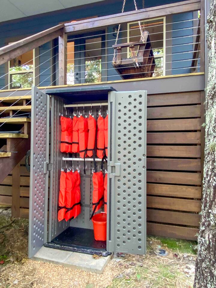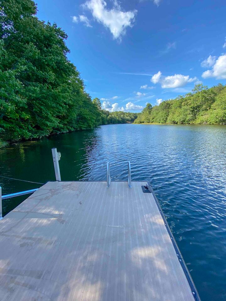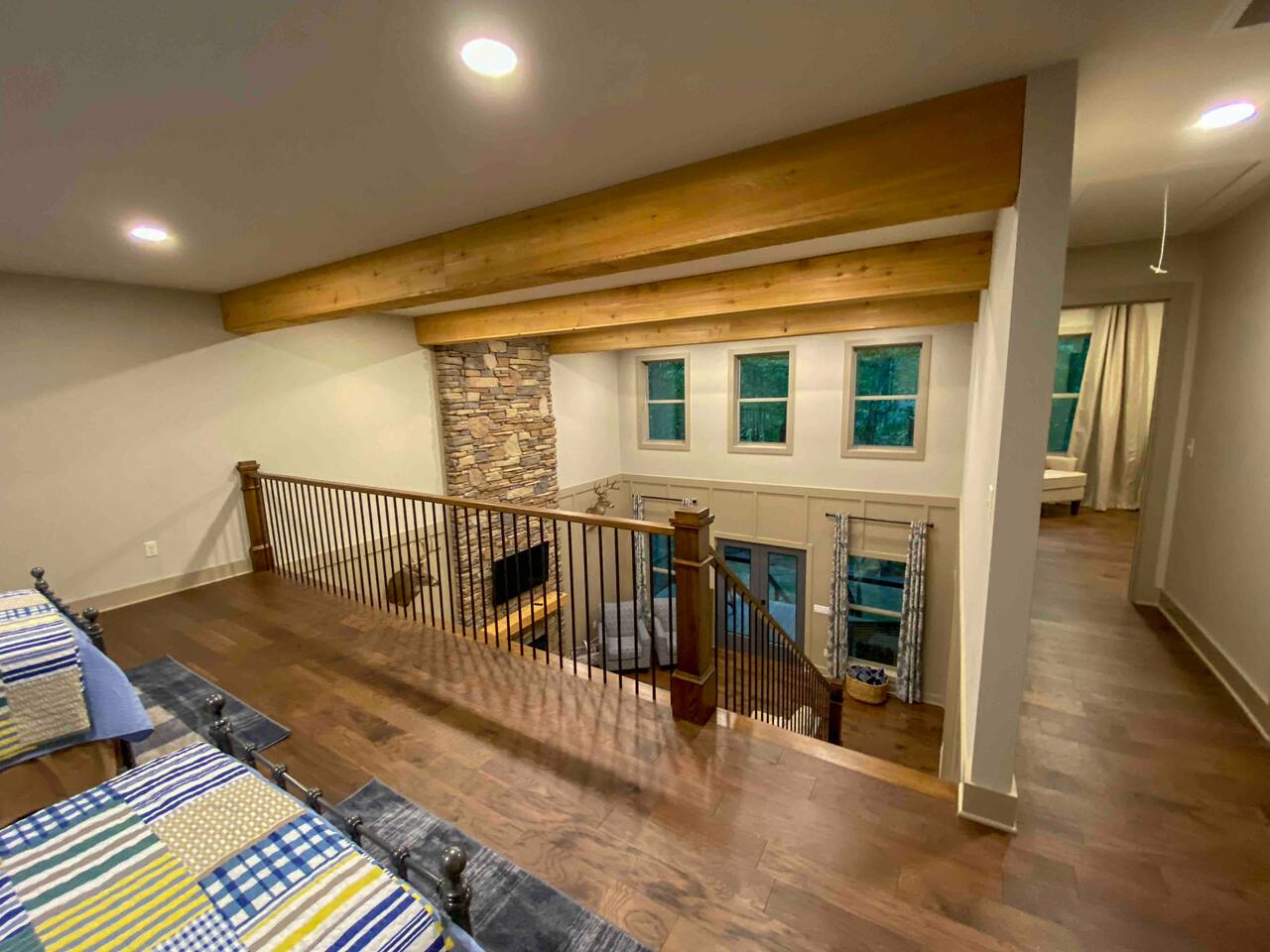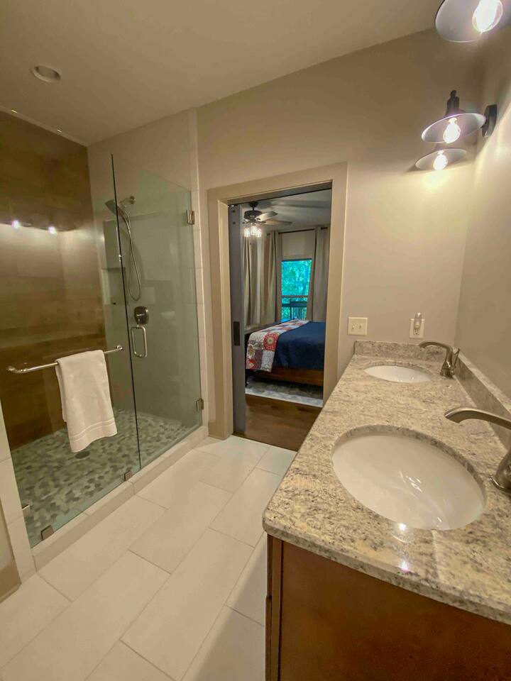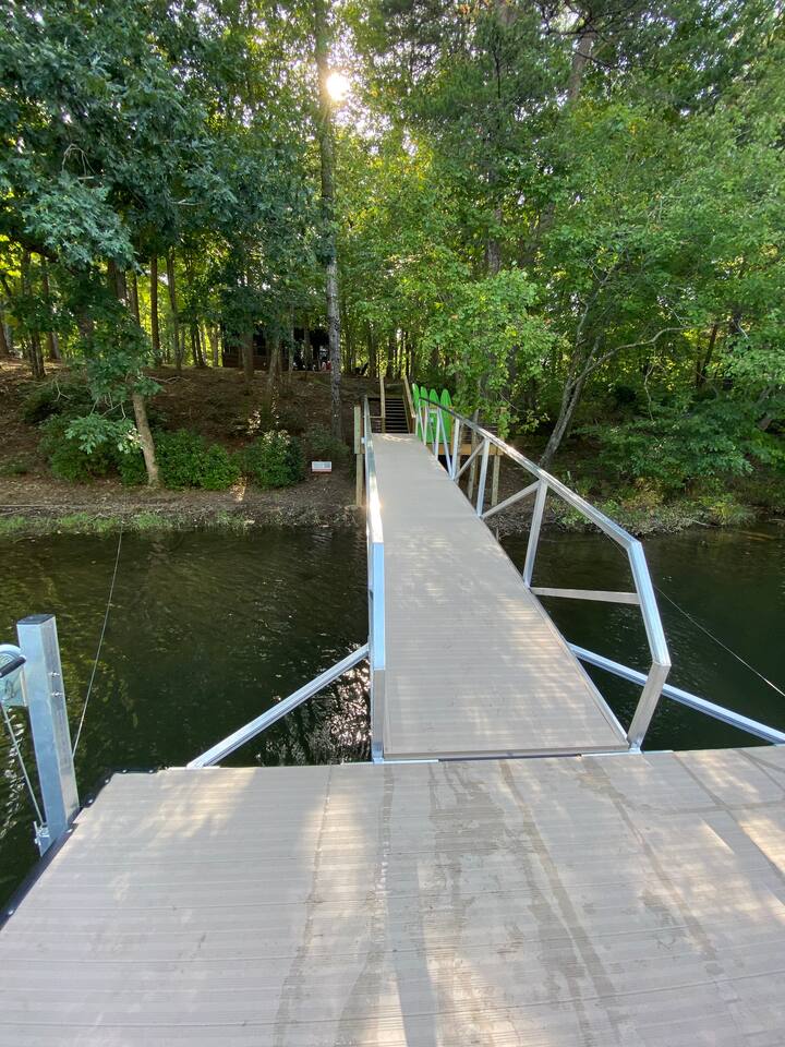 At Lazy River Cottage, enjoy a 32' long covered sitting porch facing Little River, complete with a 5’ porch swing and 4 of your favorite rocking chairs. Lazy River Cottage sleeps 10 and has three bedrooms and a sleeping loft. There are two large master bedrooms, both with king beds, private master bathrooms, and a wall of windows with beautiful river views, one on each floor. There is a third bedroom upstairs with a queen bed and semi-private bathroom that is shared with a large sleeping loft. The sleeping loft sleeps four with two twin beds, each with trundles. See the bedroom and bathroom floorplan layouts at our website littlerivervacay.com. Downstairs is "wheelchair friendly", not ADA compliant, with 36" doorways, a ramp from the parking area, and a walk-in oversized shower in the master bedroom on the main floor. The first floor also includes a half bath, a fully equipped kitchen with dishwasher, multi-cup coffee maker, microwave, custom wood island that seats two, dining area that accommodates eight, gas fireplace, and washer and dryer. The fire pit area includes adirondack chairs for enjoying the nights by the river. There is a sitting area by the water with a floating dock perfect for fishing, swimming, or kayaking.